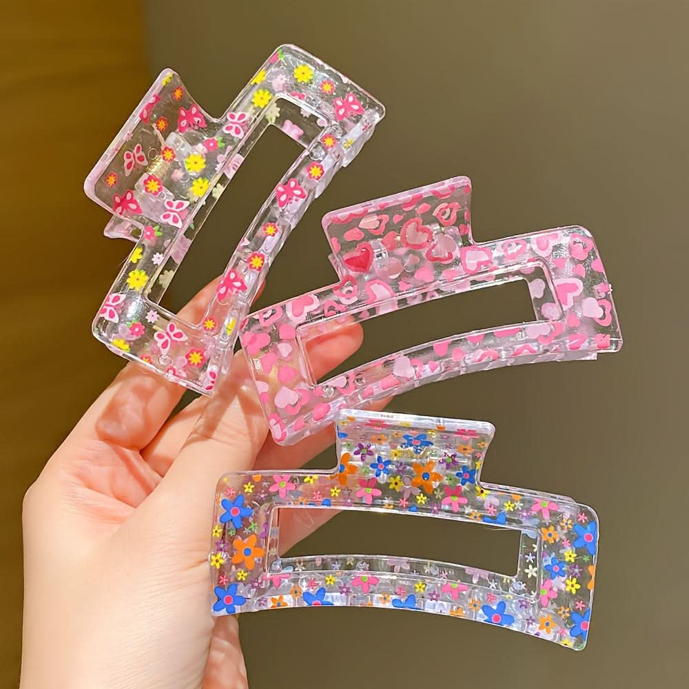 Designed with playful floral prints embedded in clear resin, these stylish Daisy Dream Transparent Claw clips bring a fresh, trendy vibe to any look. Lightweight yet sturdy, they provide a strong grip, keeping your hair secure without pulling or slipping. Perfect for quick updos, half-up styles, or casual buns, they suit both everyday wear and special occasions. Their transparent base makes the colorful patterns pop, complementing any outfit with ease. Cute, practical, and fashionable—these floral resin claw clips are a must-have accessory!