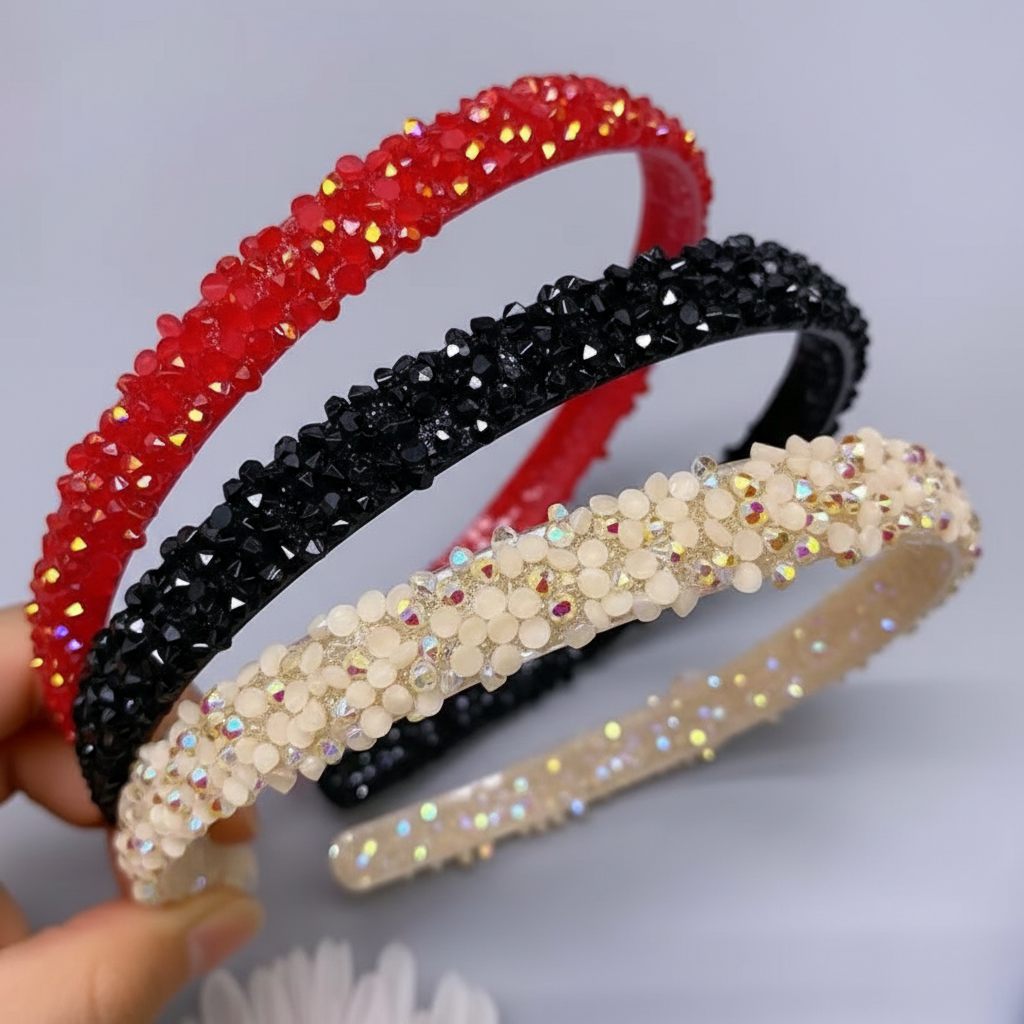 A dazzling bunch of rhinestones and crystal‑adorned headbands in purple, blue, white, red, black, and beige. Moonlit Sparkle Headbands sparkle with intricate embellishments, blending elegance and charm—perfect for elevating everyday looks or adding glamour to special occasions.