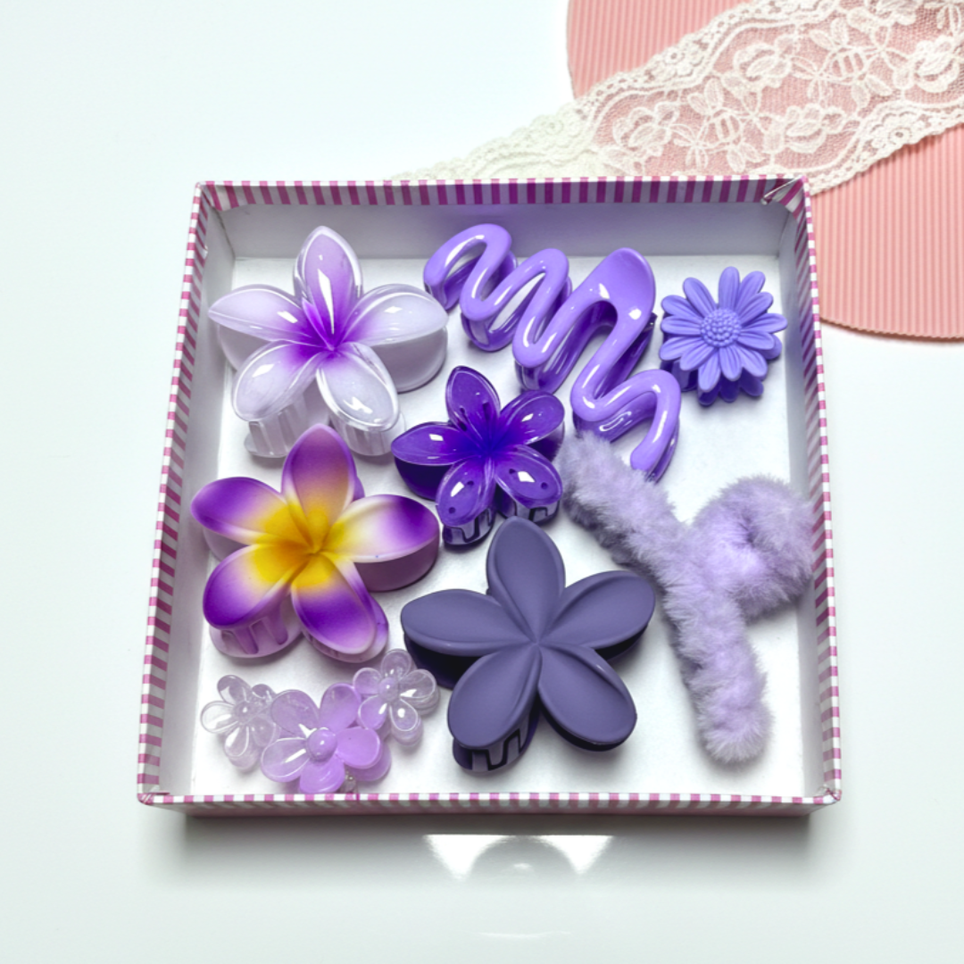 Unbox pure joy with our Oh So Pretty Combo Box! Each box includes charming flower, butterfly and geometric shape hair claw clips, perfect for daily wear or gifting. This combo box is available in beautiful colors to match every mood and outfit. 4pcs Combo Box will feature any 4 clips from the selected box.
