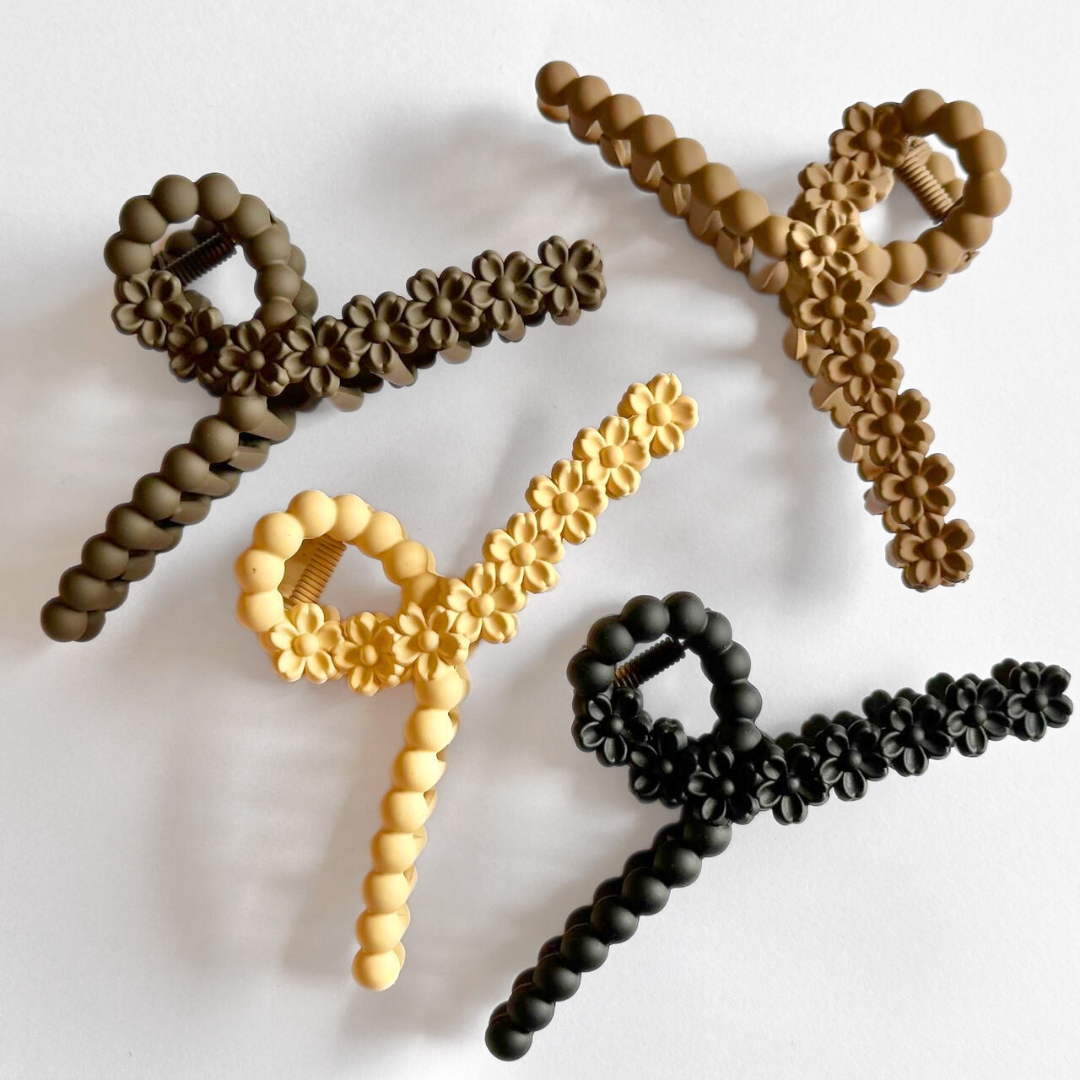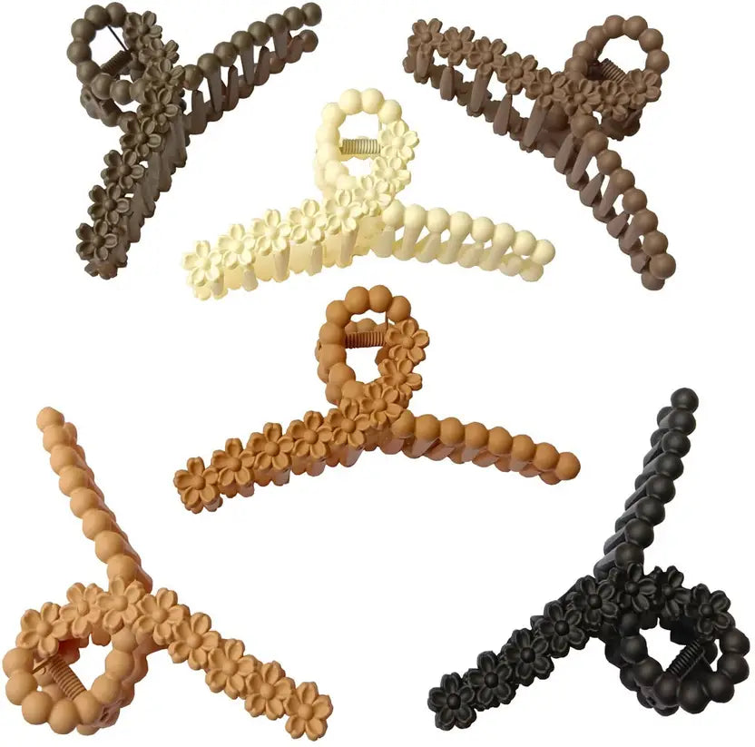 Add a touch of elegance and charm to your everyday hairstyles with the Blossom Twist Claw Clips – 4pc Matte Edition. Each clip features a unique blend of smooth rounded edges and delicate floral detailing, designed to hold hair securely while adding a soft, feminine flair. The neutral earthy tones—chocolate brown, caramel, cream, and black—make this set perfect for coordinating with any outfit. Made from durable matte-finish plastic, these clips are both functional and stylish. Whether for casual wear or special occasions, this set is a beautiful and practical addition to your hair accessory collection.